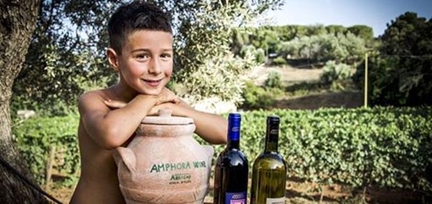 Questa estate, nella cantina di Antonio Arrighi è nato un vino bianco affinato in terracotta: si chiama “Hermia” e riproduce sull’etichetta il brand, sintetico ed efficace, che lo schiavo manager dette al suo vino 2100 anni fa.