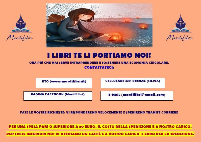 Usufruendo del nostro sito (www.mardilibri.it) che sta nascendo ora, della pagina facebook attiva e sempre aggiornata (mardilibri), del profilo Istagram (mardilibri), della posta elettronica (Questo indirizzo email è protetto dagli spambots. È necessario abilitare JavaScript per vederlo.), di Whatsapp (329-0722684), scriveteci cosa vi serve e noi provvederemo a farvelo recapitare tramite il Corriere Carrai Sandro.