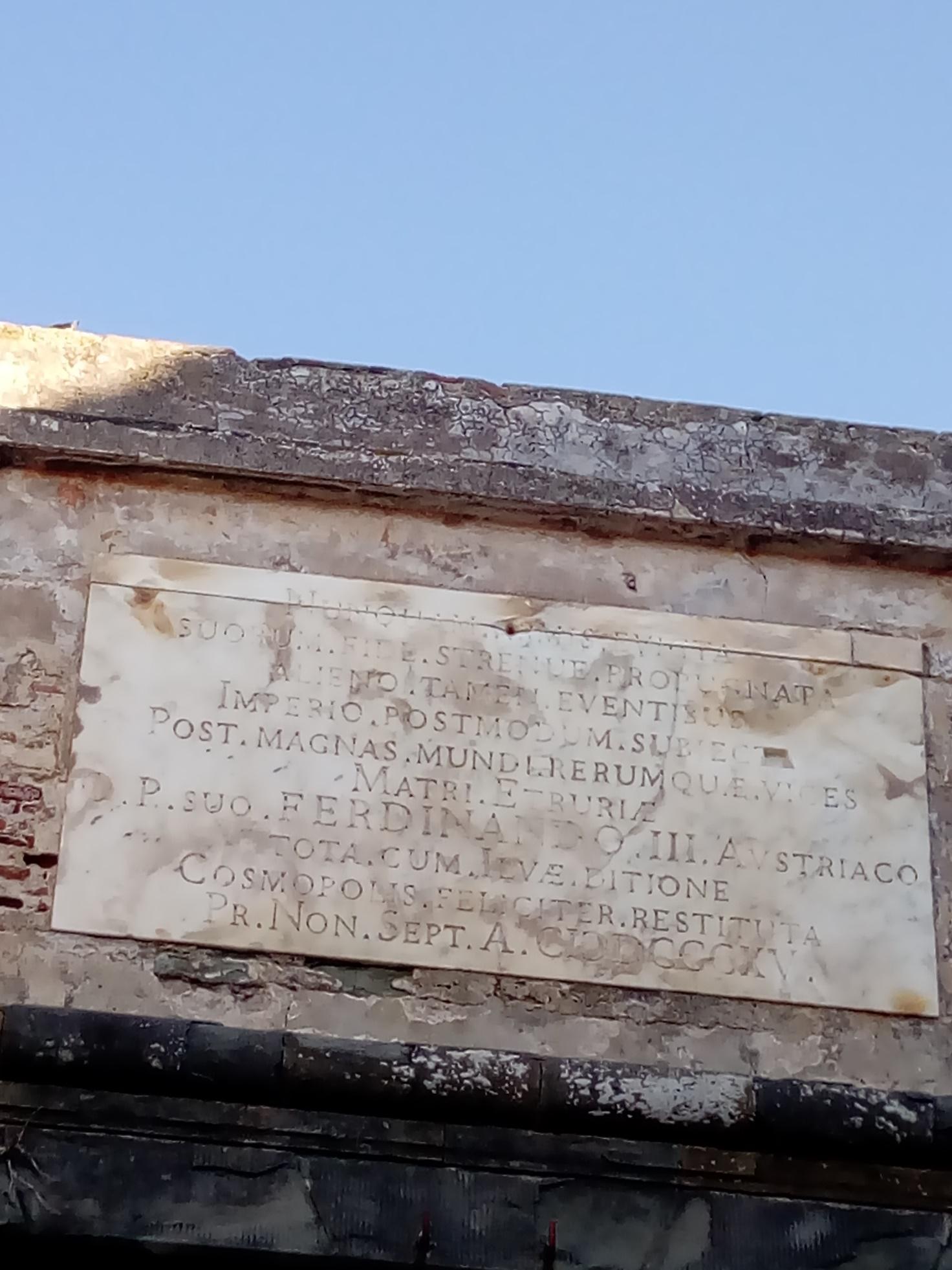 Quindi l’epigrafe commemorativa la restaurazione del dominio granducale dopo la caduta del Bonaparte che si trova immediatamente sopra la porta d’ingresso.
