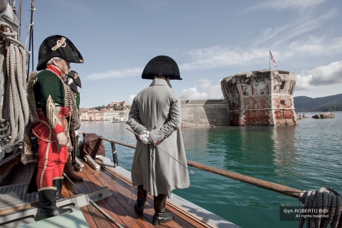 Appena sbarcato alla Punta del Gallo, fu accolto con frenetiche acclamazioni di gioia dalla popolazione di Portoferraio che aveva invaso le banchine della darsena, i baluardi, le finestre, le terrazze ed i tetti, alle quali fecero eco gli altri elbani accorsi dai diversi paesi dell'isola, aggruppati nei colli, nei promontori e sulle spiagge che fanno corona a Portoferraio.
