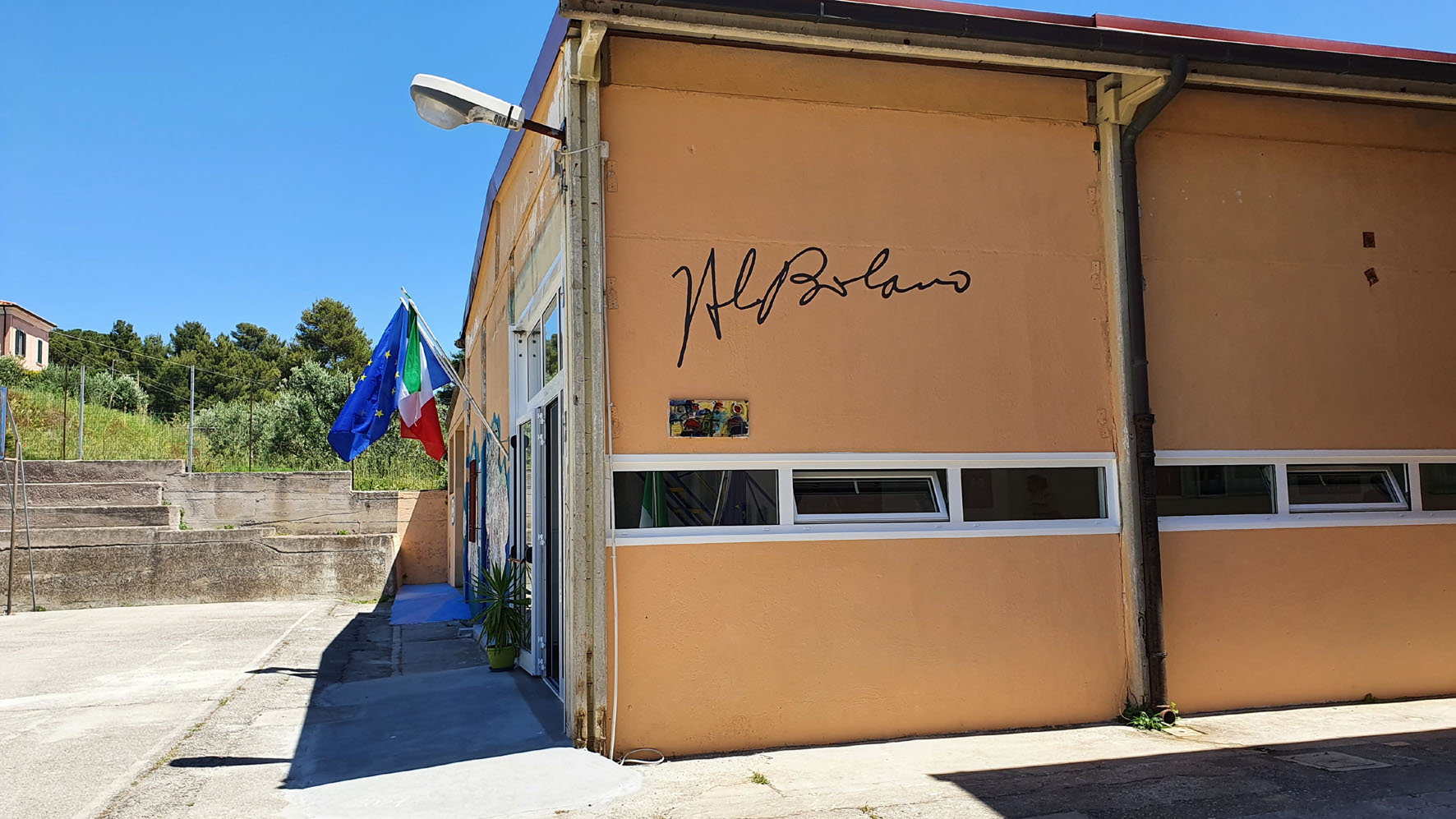 Un percorso di ceramiche di Italo conduce il visitatore dal cancello della scuola fino all’Aula sul cui muro esterno campeggia un’ enorme firma mirabilmente riprodotta.