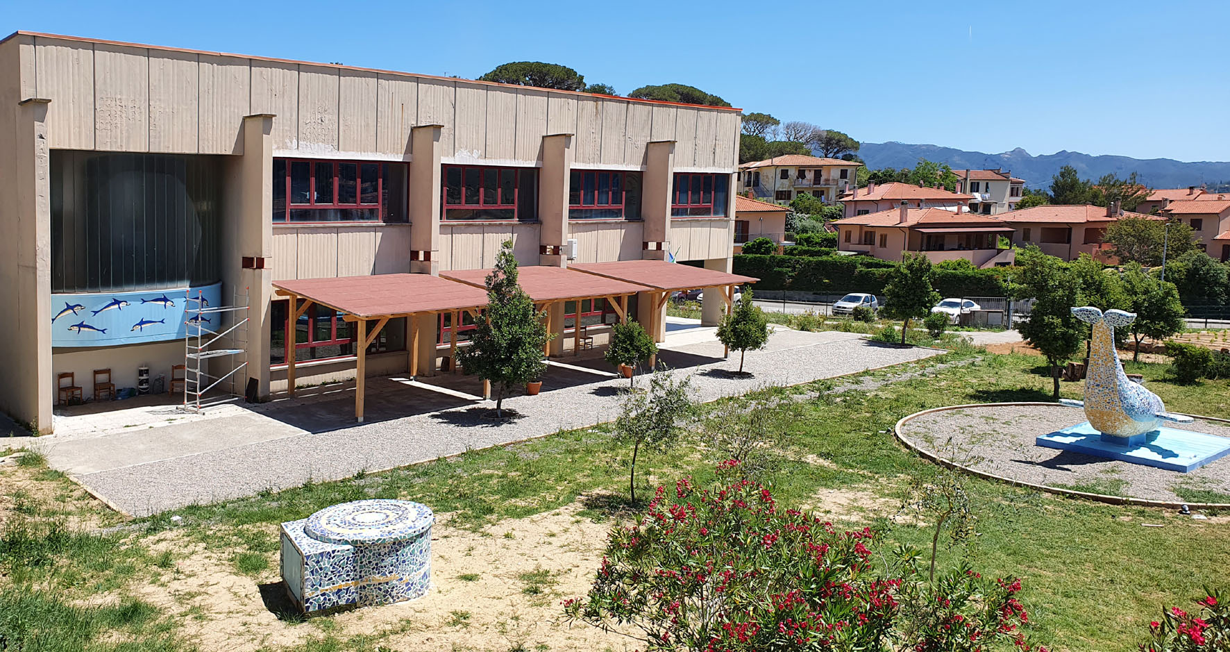 Erano presenti anche i due docenti artisti, Mauro Fontanelli che ha decorato gli interni degli edifici scolastici con immagini che evocano luoghi e situazioni elbane e prodotti del settore ristorazione ed Enza Viceconte che ha trasformato in un parco di opere fantastiche il giardino, con sirene, delfini e pesci in parte dipinti in parte ricostruiti in mosaico colorato sulle facciate, una enorme balena-fontana anch’essa in mosaico colorato, che campeggia al centro del giardino e una gigantesca scritta ISIS con lettere-sedili per didattica all’aperto : una sorta di piccolo Parco Güell alla Gaudì.