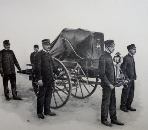 (Confraternita della reverenda misericordia di Portoferraio. Confratelli in divisa che conducono mezzo a cavallo per assistenza)