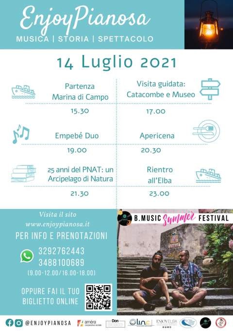 La serata si aprirà al tramonto con il concerto di “Empebè duo”, parte del ciclo B.Music Summer Festival. Il gruppo, composto da Francesco Giacalone al clarinetto e Stefano D'Arcangelo alla fisarmonica eseguirà un repertorio che passerà attraverso la Word music fino ad arrivare a rivisitazioni di grandi composizioni della cultura musicale brasiliana del ‘900, andando a finire poi nell'esecuzione di brani più classici della musica americana e italiana. Il concerto sarà accompagnato da un apericena a base dei prodotti degli orti di Pianosa, servito nel giardino del Ristorante Bar Da Brunello.