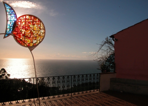 L'opera, realizzata in acciaio e vetro Dallas, fa filtrare i raggi solari creando effetti di luce molto particolari in una cornice creata dell'azzurro di cielo e mare.