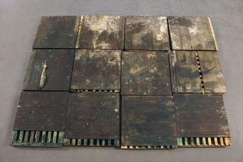 Dodici pannelli di pavimento abbandonato sono appoggiati a terra. L’intervento pittorico è minimo, volto ad arricchire gli elementi di deterioramento del legno già presenti al momento del ritrovamento.