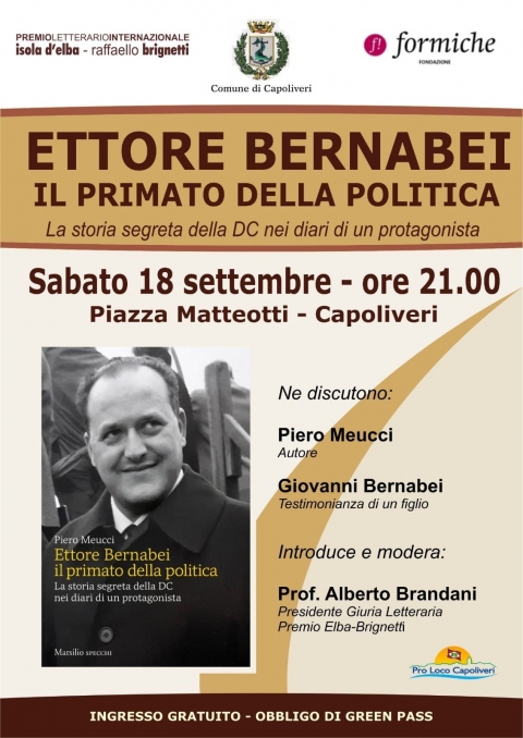 Una serata dedicata ad un uomo che è stato un simbolo della televisione italiana, una figura emblematica di un’epoca, di cui sarà possibile ripercorrere le tappe salienti di una vita umana e professionale che ha lasciato il segno attraverso il dialogo fra Piero Meucci, autore del libro “Ettore Bernabei Il primato della Politica - La storia segreta della Dc nei diari di un protagonista (Marsilio editore)”, il prof. Alberto Brandani ideatore dell’evento e Presidente del Premio Letterario Internazionale Raffaello Brignetti, Giovanni Bernabei, figlio di Ettore.