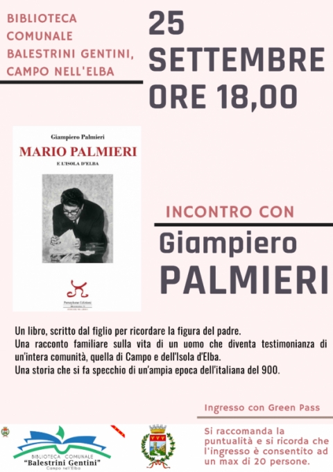 Care lettrici e cari lettori riprendono gli incontri in biblioteca, sabato 25 settembre alle ore 18 sarà con noi Giampiero Palmieri che ci parlerà del suo libro “Mario Palmieri e l’Isola d’ Elba”, Persephone Edizioni, una pubblicazione recentissima (questa è la prima presentazione) che l’autore ha dedicato al padre Mario, uomo politico impegnato nella pubblica amministrazione come consigliere comunale, consigliere provinciale, presidente dell’EVE (Ente Valorizzazione Elba ), con ruoli importanti in altre istituzioni.