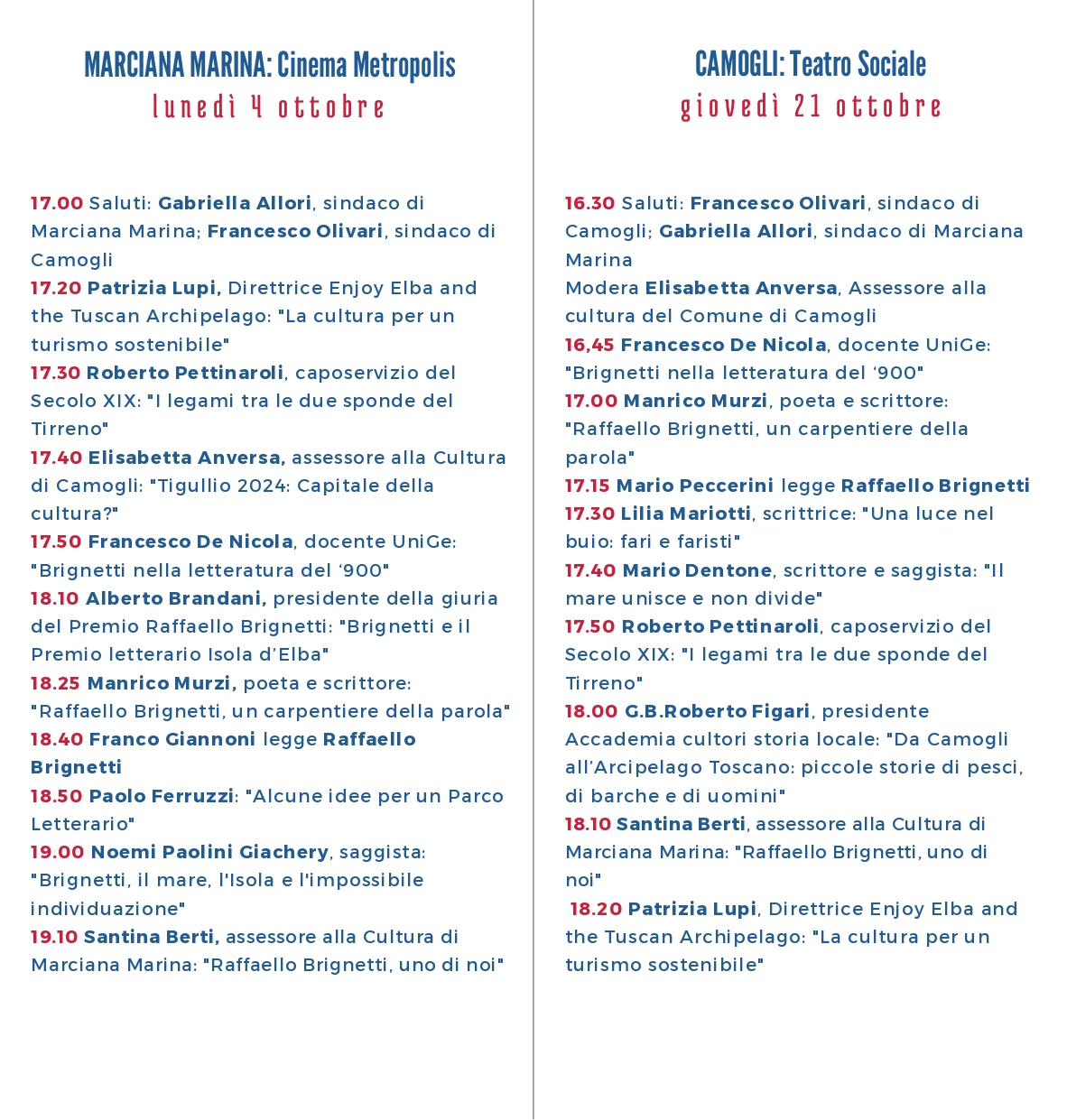 Introduce la giornalista Patrizia Lupi, direttrice del magazine: Enjoy Elba and the Tuscan Archipelago, mentre il giornalista Roberto Pettinaroli, caposervizio del Secolo XIX parlerà dei legami sociali, culturali e commerciali fra le due sponde del Tirreno. L’attore Franco Giannoni leggerà alcuni brani dalle opere dello scrittore mentre Paolo Ferruzzi ricorderà Brignetti ed altri autori, nati o che hanno frequentato l’Elba, per gettare il seme di un parco letterario e artistico da realizzarsi sull’Isola.