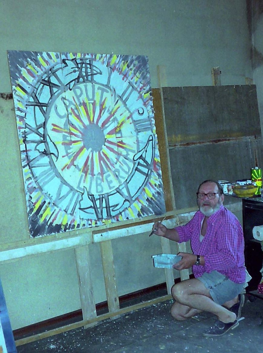 Proprio in questi giorni (quando si dice “il caso”) nel riordinare l’immenso archivio fotografico di Italo mi sono venute alla mano delle vecchie negative a colori che hanno rivelato le foto di Italo, assolutamente inedite e che qui proponiamo, mentre realizzava il dipinto originale dell’orologio di Capoliveri con i colori ceramici che risultano molto chiari perché non ancora cotti a 960 °C.