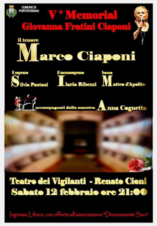 Concerto lirico per onorare la memoria di Giovanna Fratini Ciaponi, l'insegnante di canto elbana scomparsa prematuramente l’8 dicembre 2016 all’età di 63 anni, sabato sera alle 21.15 al teatro dei Vigilanti-Renato Cioni. A promuovere l'iniziativa è Marco Ciaponi, figlio di Giovanna, uno dei giovani tenori più quotati nel panorama internazionale della lirica, che ne sarà il principale protagonista. Insieme a lui, ad esibirsi nella quinta edizione dell'atteso 'memorial' saranno il soprano Silvia Pantani,, il basso Matteo D'Apolito ed il mezzosoprano Ilaria Ribezzi, tutti quanti professionisti già in carriera nei maggiori teatri italiani e stranieri. Ad accompagnarli al pianoforte sarà la maestra Anna Cognetta.
