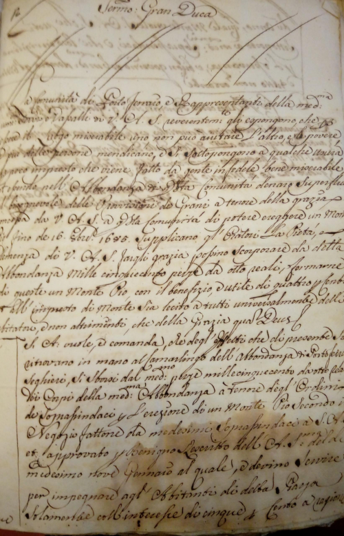 La Comunità di Portoferraio e Rappresentanti della medesima Um.mi Serv.ri e vassalli di V.A.S. reverentissimamente gli espongono che per essere il luogo miserabile uno, non può aiutare l’altro, e le povere e più delle perone mendicano e si sottopongono a qualche usura per poco impresto che viene fatto da gente infedele, bene miserabile, et essendo nell’Abbondanza di questa Comunità denaro superfluo al bisognevole delle Provvisioni de Grani, a tenore della grazia concessa da V.A. S. a questa Comunità di poter ereggere un Monte Pio fin de 16 ottobre 1699. Supplicano gli Oratori la Pietà e la Clemenza di V.A.S. di fargli grazia possino scorporare da detta Abbondanza mille cinquecento pezze da otto reali,formarne di questo un Monte Pio con il benefizio ed utile di quattro per cento et all’impresto di Monte sia lecito a tutti universalmente delli abitatori e non altrimenti che della Grazia qua DeusS.A. vuole e comanda che degl’effetti che di presente si ritrovano in mano al Camarlingo dell’Abbondanza di Portoferraio, Sighieri, si sborsi dal medesimo pezze millecequecento da otto reali dai Corpi della medesima Abbondanza a tenore degl’Ordini dei Soprassindaci per l’erezione di un Monte Pio secondo il negotio fattone da medesimi Soprassindaci a S.A.S. et approvato per Benigno rescritto dell’A S. del dì medesimo 9 gennaio al quale e devino servire per impegnare agl’Abitanti della Piazza solamente coll’interesse di cinque per cento a ragione di anno, quale Monte vuole S.A.S. resti sottoposto ai medesimi Soprassindaci e che loro invigilino per l’osservanza e buon governo dello medesimo gl’ordini e tutto non ostante
