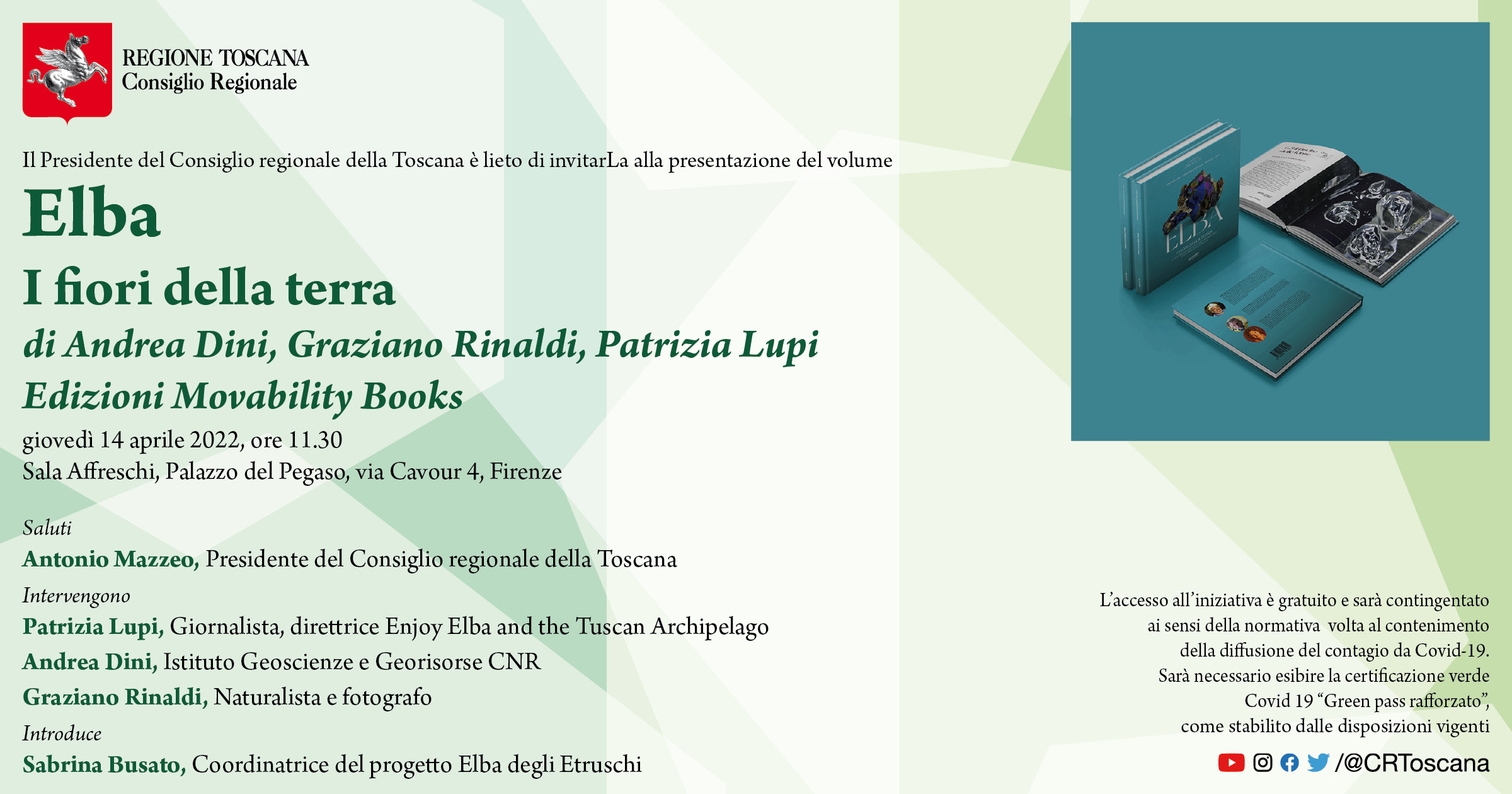 Si terrà giovedi 14 aprile a partire dalle ore 11.30, presso la Sala Affreschi di Palazzo Pegaso del Consiglio Regionale Toscana a Firenze, la presentazione del volume “Elba: I Fiori della Terra – la straordinaria diversità geo-mineralogica della terra degli Etruschi”, secondo quaderno della rivista Enjoy Elba and the Tuscan Archipelago per i tipi dell’editore Movability Books-Simtur.