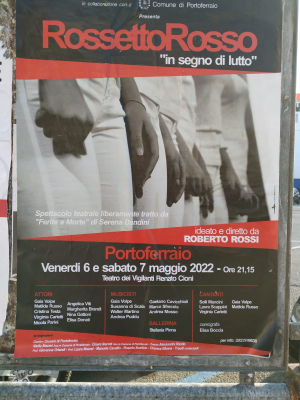 La piéce del regista Roberto Rossi, 'Rossetto rosso ...in segno di lutto', stigmatizza in maniera semplice e poetica la violenza contro le donne; sono le stesse ragazze uccise, in scena con semplici vesti bianche, a riassumere sogni e progetti di vita infranti e il contesto di patriarcale violenza che - in ogni parte del mondo - sta all'origine di questa cultura del possesso e della morte e, metaforicamente, delle stesse guerre.