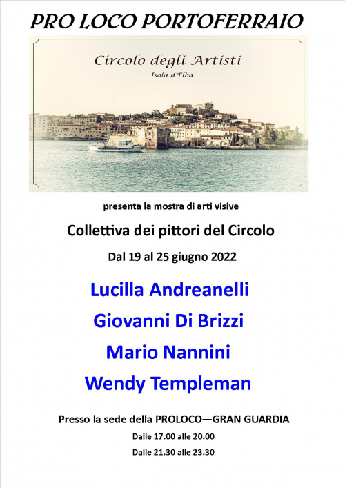 Si aprirà domani, domenica 19 giugno alle ore 18 a Portoferraio, nella centralissima Piazza Cavour, presso i locali della “Gran Guardia”, la mostra dei Pittori del Circolo degli Artisti Isola d’Elba.
