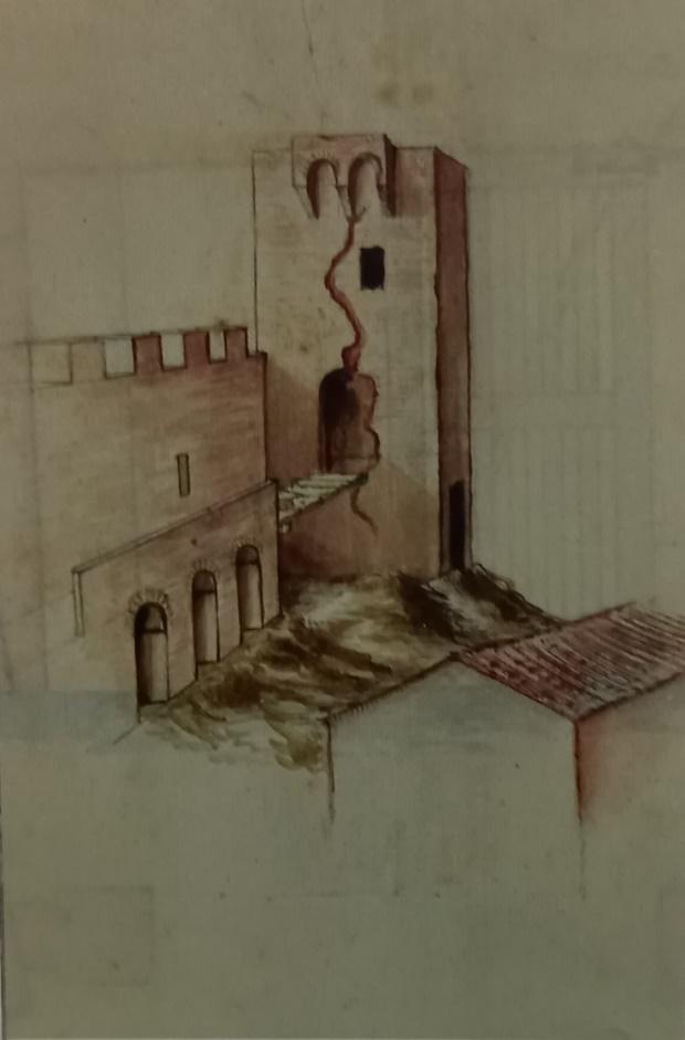 Due stanze dunque, una “sotto la volta”la quale dalla visione del disegno è posta in alto che insieme ad un’altra stanza che doveva essere posta in basso dividevano in due spazi l’altezza totale della torre.