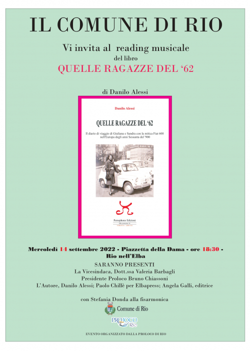 Il Comune di Rio vi invita al reading musicale del libro 'QUELLE RAGAZZE DEL ‘62' di Danilo Alessi, appuntamento mercoledì 14 settembre alle ore 18,30 nella Piazzetta della Dama a Rio nell’Elba.