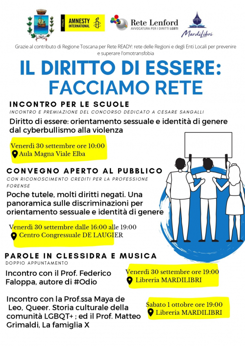 L’evento, organizzato dal Comune di Portoferraio grazie ai fondi ricevuti dalla Regione Toscana, in quanto iscritto alla rete R.E.A.DY (la Rete nazionale delle Regioni e degli Enti Locali per prevenire e superare l’omotransfobia) vede la co-partecipazione di Amnesty International, Rete Lenford – Avvocatura per i diritti LGBTI e Mardilibri, portando all’Elba persone esperte a livello internazionale del tema.