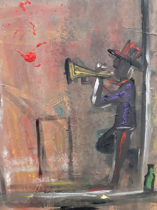 Dagli sfondi, creati tramite fitte sovrapposizioni di tinte accese, emergono musicisti e personaggi isolati resi con diversi stili - dal naif al tratto fumettistico, fino all'arte urbana di Haring e Basquiat - quasi sempre attori solitari su un palcoscenico sgargiante e metafisico.