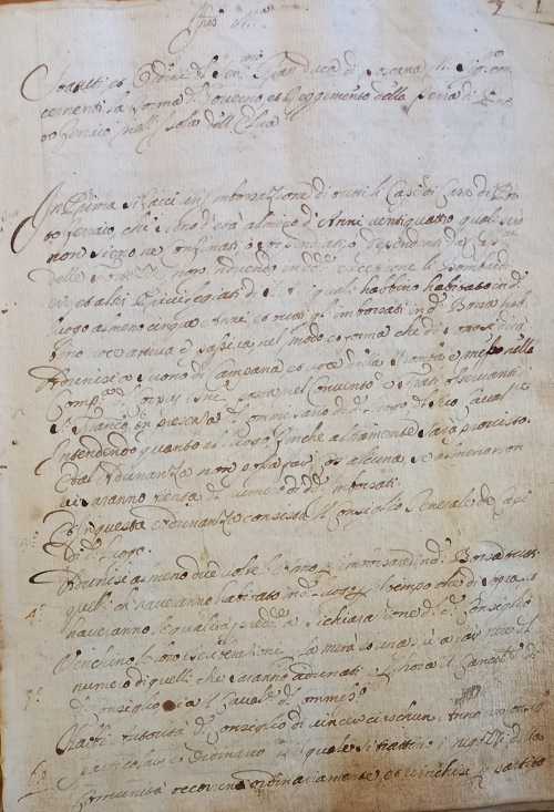 Di seguito trascrivo le carte di archivio del testo dello Statuto di Portoferraio vigente nel 1700 relativo alle sole norme riguardanti la costituzione della magistratura comunitativa (vedi foto della prima carta).
