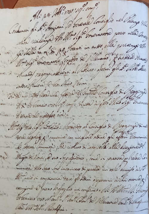 Coadunati gli Anziani e il Generale Consiglio nel palazzo della solita residenza dell’ill.mo Sig.re Governatore posto nella Fortezza della Stella in numero di 20 stanti in tutto alla presenza dell’Ill.mo Sig Governatore Leopoldo di Villanova per trattare negozi attinenti al Pubblico.= assenti gli Ill.mi Dr Alessandro Rinieri e Gio Silvio Vesini=