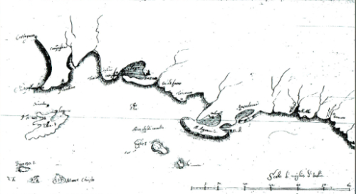 - Triangolo del corallo nella mappa dell’arcipelago toscano con segnata la secca dei coralli vicino all’isola del Giglio. Archivio storico nazionale di Madrid. Ripreso da Lucia Paoli in “Lo Scoglio. Elba, ieri, oggi, domani” 2014