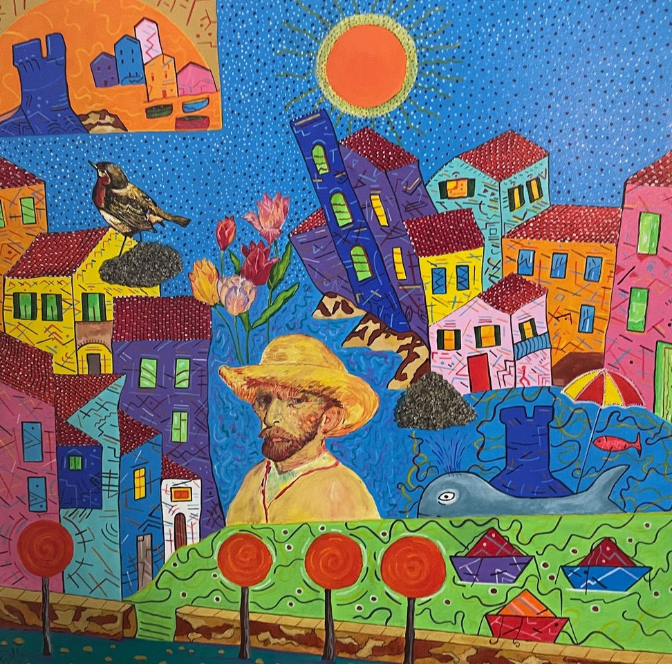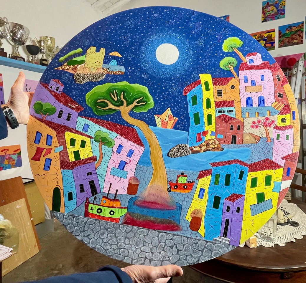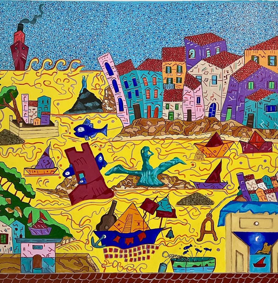 Aldo, conosciuto ovunque per le sue imprese atletiche, corre maratone in tutto il mondo, è un uomo gentile sempre sorridente. Con lo stesso approccio rispettoso con cui corre e cammina per l’isola il lungo e in largo, dipinge il suo amore sincero per la sua terra in cui è cresciuto, trasfigurandola in vortici sognanti in cui figure, colori e architetture si fondono per restituirci un’Elba pura e incontaminata nella sua essenza.