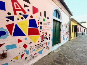 Qui, fra le basse case restaurate, piante e fiori, accade come un’epifania, si apre uno scorcio inaspettato, sognante, pacifico e allo stesso tempo carico di energia positiva: è lo studio del pittore marinese Aldo Allori.