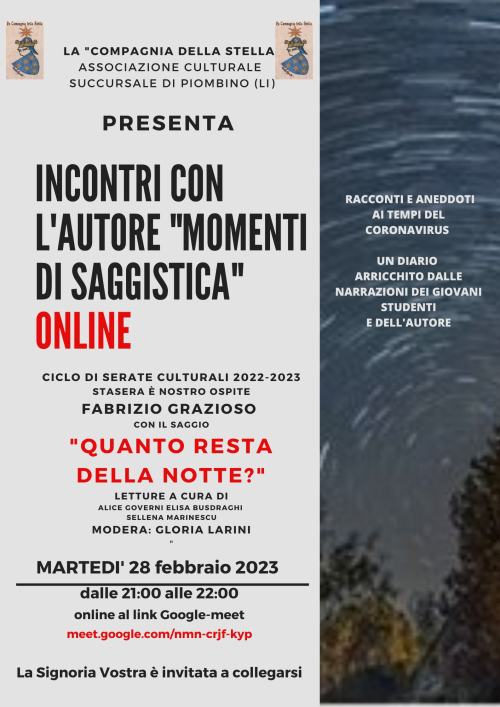 Il ciclo di serate culturali presentato dall’associazione Compagnia della Stella di Piombino prosegue con il percorso “Incontri con l’autore online” martedì 28 febbraio dalle ore 21 alle ore 22. L'ospite questa volta è Fabrizio Grazioso, scrittore elbano, che parlerà del libro "Quanto resta della notte? Porto Azzurro ai tempi del Coronavirus", pubblicato da Federighi Editori nel 2022.