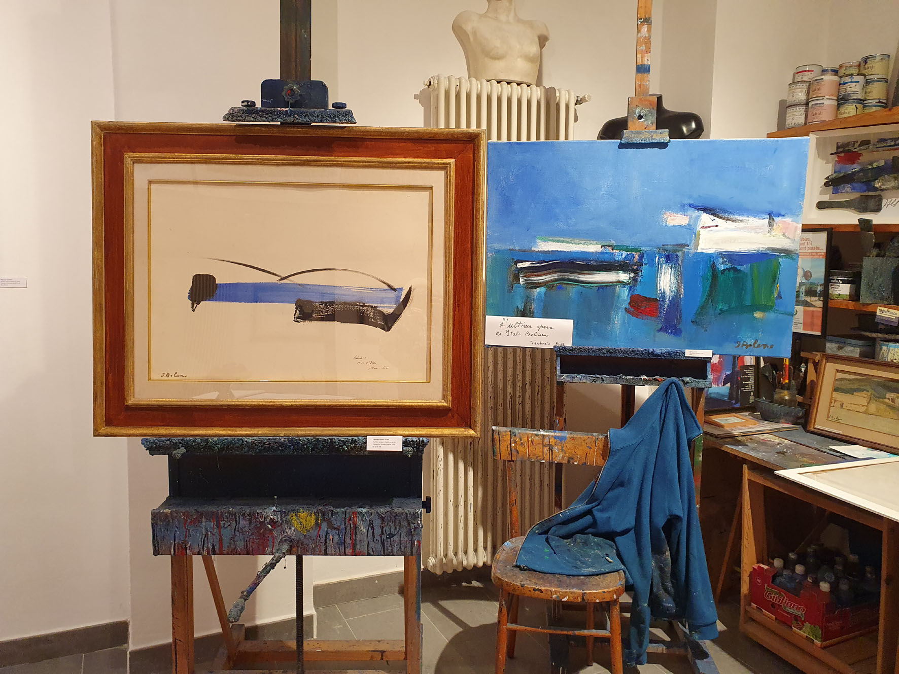 La terza, che spicca con il suo blu cielo fu inaugurata l’ultima estate di permanenza di Bolano all’Isola, nel 2018, grazie all’iniziativa del Sindaco Gabriella Allori alla presenza dei coniugi Noemi ed Emerico Giachery, letterati di altissimo spessore, mai abbastanza ricordati e che a Marciana risiedono tutte le estati (e Noemi è Marcianese anche di nascita). Anche in quella occasione gli acquerelli firmati da Luzi furono esposti alla biblioteca di Marciana: gli stessi che oggi, riuniti tutti e 13, hanno accolto moltissimi visitatori per due mesi e mezzo e sono esposti ancora per 2 giorni all’Open Studio Italo Bolano, in una bella mostra dal titolo “Doppia visione” curata da Erica Romano, direttrice dello Spazio d’Arte pratese e del Museo elbano.
