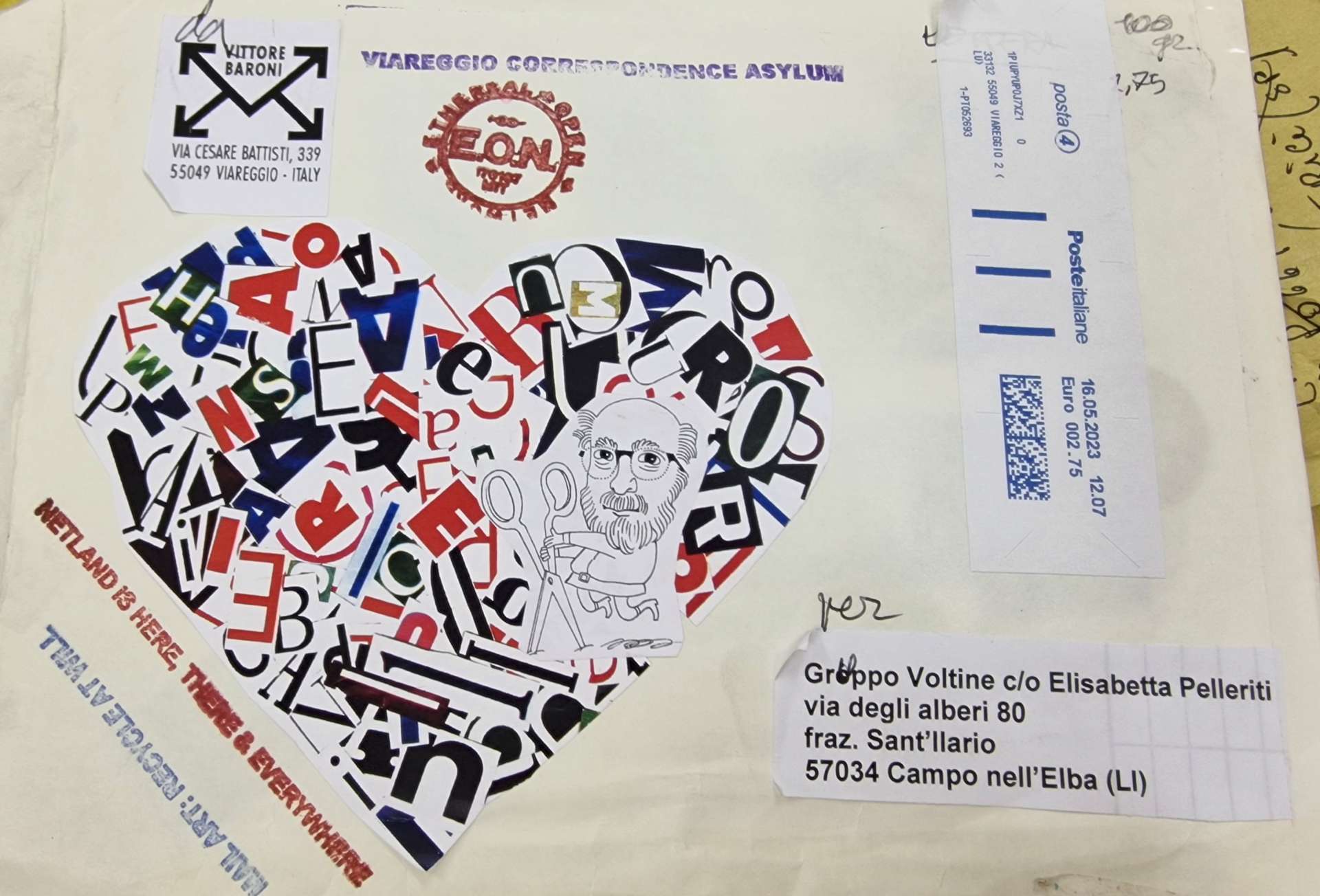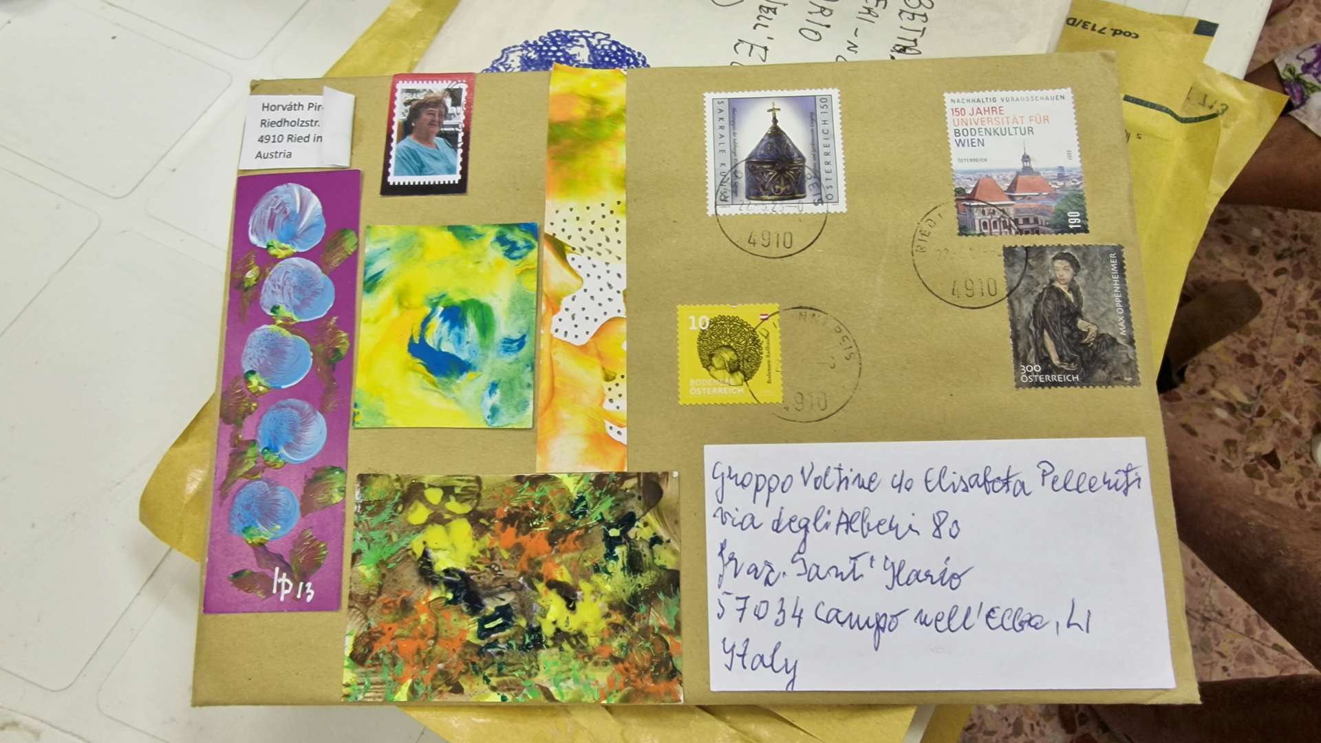 Dal mese di maggio stanno arrivando quotidianamente opere di mail art da tutto il mondo. Infatti è stata creata una call dai curatori Federica Frati e Nico Carone, che si è diffusa molto rapidamente ed ha coinvolto, grazie anche all’intervento di storici mail artists- quali Ruggero Maggi, Roberto Formigoni, Vittore Baroni, Luc Fierens- moltissimi artisti, parte della loro fittissima rete di contatti. Il tema Rinascita ha entusiasmato questi creativi, che da sempre usano la loro arte, non tanto per entrare nei canonici circuiti commerciali delle gallerie, ma per rompere barriere, urlare verità, seminare nuove idee. Ecco che a Sant’ilario la cassetta postale di Elisabetta è stipata di buste e cartoline provenienti da tutto il mondo.