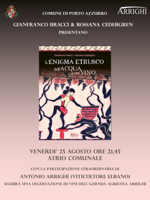 Venerdì 25 Agosto alle ore 21.45 presso l'atrio del Comune di Porto Azzurro si terrà la presentazione del libro "L'Enigma Etrusco dell'Acqua e del Vino" scritto a quattro mani da Gianfranco Bracci e Rossana Cedergren.