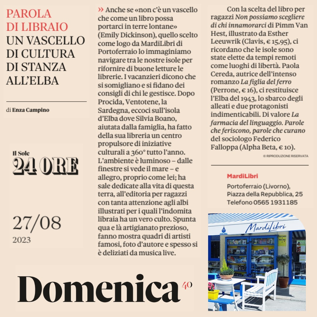 Il titolo "Parole di libraio - Un vascello di cultura di stanza all'Elba" redatto dalla giornalista Enza Campino.