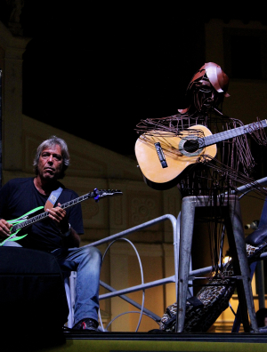 ma lega anche la figura di De Andrè stilizzata con i musicisti che da anni celebrano e raccontano l'opera di Faber qui rappresentati da Cesareo (e che nell'immagine completa di questo momento sono proprio a sinistra di Davide).