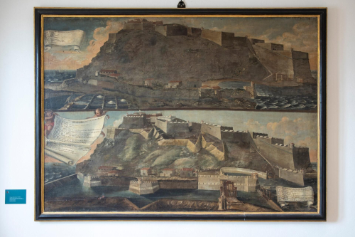 Il dipinto è intitolato “Disegno delle nuove fortificazioni perfezionate per la parte di terra della piazza di Portoferraio“.