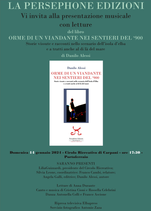 Sarà presentato domenica 14 gennaio alle ore 17:30 presso il Circolo Ricreativo di Carpani a Portoferraio. Un vero e proprio happening, un reading musicale, intercalato da spettacoli di danza. Alla conclusione un piccolo rinfresco.