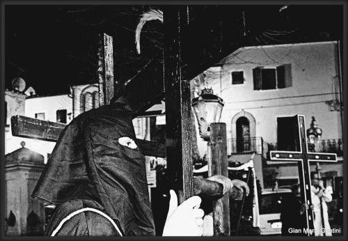 Una seconda croce, illuminata da lampade votive, rischiarava il cammino per i confratelli incappucciati che la sorreggevano. Altre croci di varie dimensioni, tra cui una di castagno raffigurante il Cristo crocifisso, completavano il corteo. Il coro intonava canti liturgici solenni - il Piangi, lo Stabat Mater, il Miserere, il Vexilla Regis e le Piaghe - che permeavano l'atmosfera di un'austera mestizia.