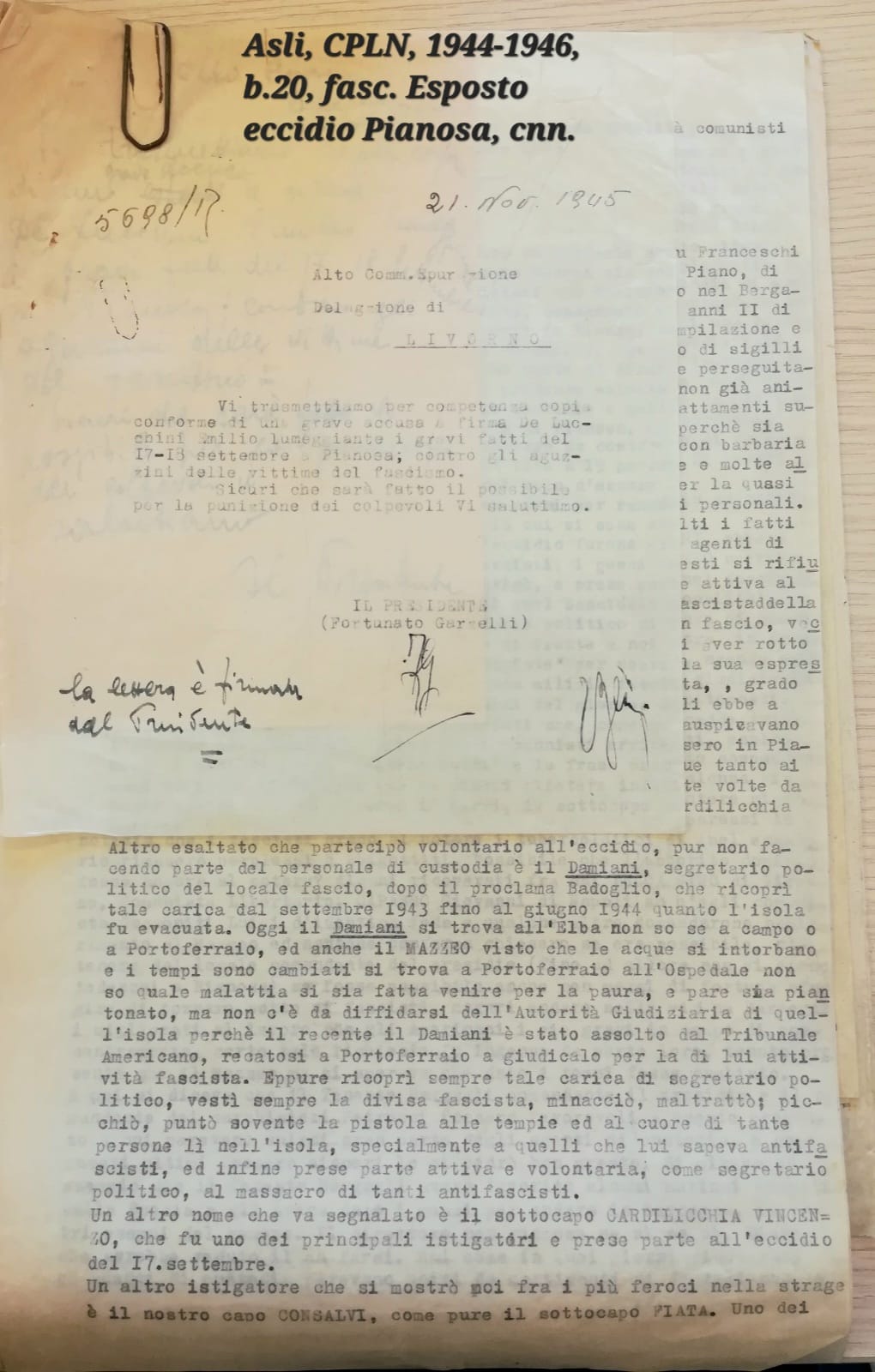 L’accusa fu inoltrata da Emilio De Luchini al Comitato Provinciale di Liberazione Nazionale e all’Alto Commissariato Epurazione; era il febbraio del ’45, poche settimane prima della Liberazione del nord e agli inizi della ricostruzione sociale, politica e amministrativa della Nazione. L’esposto, lungo ben dieci pagine, è una minuziosa descrizione di una vicenda i cui fatti, dei quali avevo appena sentito parlare, mi sembravano contornati da un velo di leggenda e macabro mistero. La strage di Pianosa, al quale seguì quella di Procchio, mi colpirono e intrigarono tanto da cominciare una ricerca bibliografica e d’archivio, probabilmente incompleta ma di sicuro valore. Oltre ad alcune biblioteche e il citato Archivio di Stato di Livorno, su segnalazione consultai un faldone dell’Archivio Storico di Marciana e feci un salto a Lucca presso l’Istituto Storico della Resistenza e dell’Età Contemporanea, per visionare un documento relativo all’indagine del maggiore Smith Ruthven nelle funzioni della War Crime Commission: ulteriore tassello utile per comporre un imbrogliato puzzle, per trovare conferme o confutazioni alle varie tesi e argomentazioni esistenti.