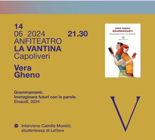 Primo appuntamento in pazza della rassegna letteraria Autorə in Vantina, giunta quest’anno alla quarta edizione. Venerdì 14 giugno 2024, alle ore 21:30, nell’anfiteatro La Vantina a Capoliveri tornerà per il terzo anno consecutivo Vera Gheno, accompagnata questa volta dagli interventi di Camilla Moretti, studentessa di lettere.