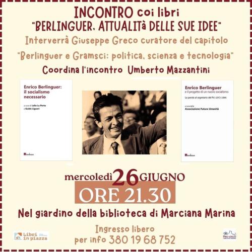 Una interessante iniziativa di "Incontro con i libri" è in programma a Marciana Marina al quale parteciperà Giuseppe Greco, uno degli autori del libro "Enrico Berlinguer: il socialismo necessario" e che vede la partecipazione come moderatore della serata di Umberto Mazzantini.