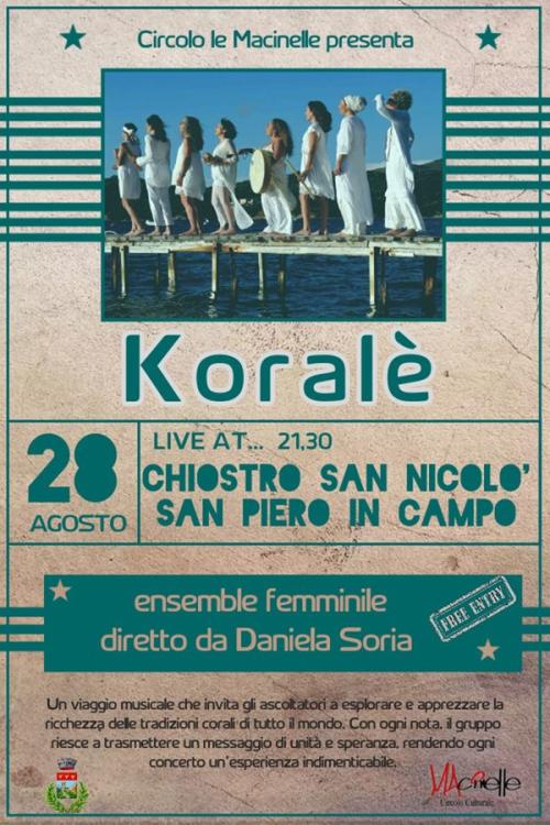 Appuntamento mercoledì 28 agosto alle 21,30 nel chiostro di San Niccolò a San Piero con il gruppo vocale Korale’, diretto dalla talentuosa Daniela Soria, è una formazione unica nel suo genere, composta interamente da donne. Questo ensemble si distingue per il suo repertorio variegato, che abbraccia musiche e canzoni provenienti da ogni angolo del globo.