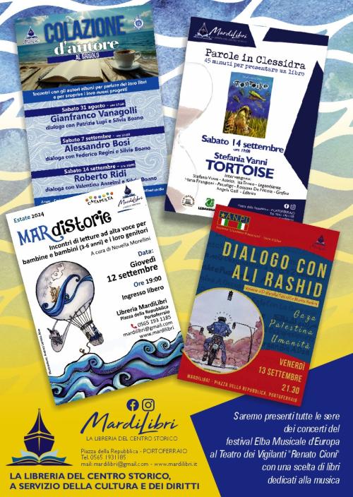 Saremo presenti tutte le sere dei concerti al Teatro dei Vigilanti "Renato Cioni", come già successo nelle precedenti edizioni, in occasione della ventottesima edizione di Elba Isola musicale d'Europa, con una scelta di libri dedicati alla musica.