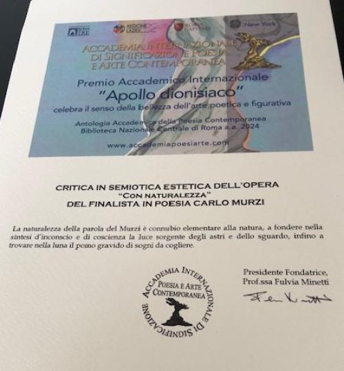 Carlo Murzi e la sua opera "Con Naturalezza" ricevono dall'Accademia Internazionale di Significazione Poesia e Arte contemporanea di Roma il riconoscimento "Critica in SEMIOTICA ESTETICA" del Premio Accademico Internazionale "Apollo dionisiaco".