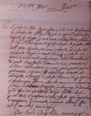 Lo attesta una carta di archivio dove con mandato di procura Gio Paolo Angiolini deputa il signor Dott. Francesco Angelo Rutigni a presentarsi in sua vece in cancelleria a promettere in solido con lui di essere mallevadore per un anno del camarlingo Gio. Batta Corsi, ”per ogni e qualunque danno“.