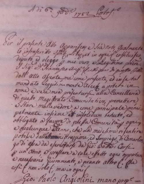 Per il presente atto apparisca e sia noto qualmente ,io infrascritto spontaneamente li presento ed in ogni caso costituisco deposito ed eleggo per mio vero e legittimo procuratore il Signor Dottore Francesco Angelo Rutigni qui di questa città dall’atto assente ma come presente ed in tal mandato legittimamente accetta in nome e vece mia presentarsi alla Cancelleria di questo Magistrato Comunitativo, promettere s stare mallevadore e come principale principalmente insieme insolidum tenuto ed obbligato a favore di questa Comunità per ogni e qualunque danno che medesima risentirà potesse dall’Amministrazione ed impiego di Camarlingo di essa da esercitarsi da Gio Batta Corsi per un’anno e prestare a tale effetto ogni opportuno e necessario giuramento e quanto altro