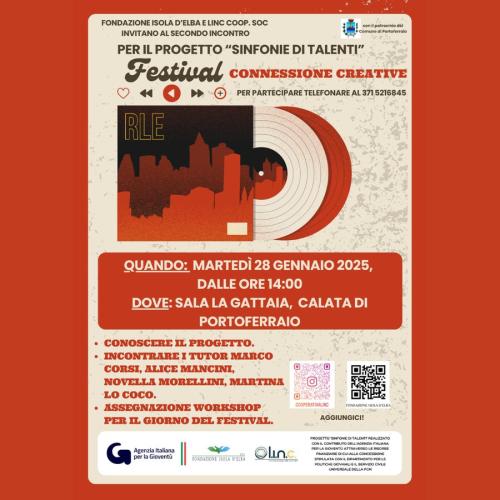 Il giorno martedì 28 gennaio 2025 dalle ore 14 alle ore 15.30 la Sala della Gattaia (via Vittorio Emanuele II, Portoferraio), ospiterà il gruppo di lavoro del Festival “Sinfonie di giovani talenti”, progetto di cui è capofila la Fondazione Isola d’Elba, approvato con determina commissariale il 21 agosto 2024, con prot. AIG/237 n° 237/2024, dalla Agenzia Italiana della Gioventù nell'ambito dell'Avviso Pubblico “NEETwork: connessioni creative. Favorire processi di attivazione e inclusione delle giovani generazioni”, approvato con determina commissariale il 23 maggio 2024, con prot. AIG/ 142-2024.