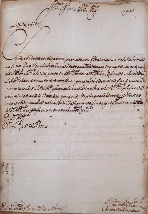 Sarà condotto costà con questa mia un tal Malostici se io non erro il quale dopo essere stato qualche tempo in queste carceri vuole il Padrone Serenissimo che sia posto in codesta fortezza del Falcone dove è mente di S. A. Reale che vi sia tenuto ristretto e non possa da essa sortire o a nuova commissione dell’A. S. Reale la quale vuole inoltre che VS Ill.ma gli faccia somministrare il vitto a proporzione e di più qualche cosa per il vestito in caso che ne avesse necessità