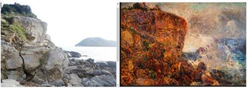 Passando lungo la spiaggia prima di salire sul sentiero che inizia proprio qui, mi è sembrato di riconoscere l'immagine e quindi ho scattato la foto che propongo affiancata al quadro, con in lontananza il promontorio di Capo e Monte Poro, nella prospettiva molto vicino al margine delle scogliere in primo piano. Queste appaiono un po' diverse ma sembra abbastanza netta la somiglianza del grande blocco dalla struttura superiore a piattaforma con tanto di cespuglio ovviamente cresciuto. Nel quadro appaiono anche alcune linee di sedimentazione presenti nella struttura litica visibile in foto (si tratta di rocce sedimentarie, la componente di calcari marnosi del cosiddetto Flysch cretaceo, segnate dalle linee di deposizione dei sedimenti). In primissimo piano sono le rocce più confuse nella rappresentazione pittorica che appaiono irregolari anche nell'immagine fotografica: dovremmo tener conto anche dell'interpretazione artistica del pittore e dei cambiamenti legati al fatto che è passato ormai un secolo dalla realizzazione del dipinto, con lo svolgersi di eventi naturali e umani quali mareggiate, alluvioni e l'episodio bellico, forse tra i più drammatici della storia elbana, che fu lo sbarco alleato del 1944. Non dimentichiamoci che proprio a ridosso di questi scogli il Regio Esercito, successivamente alla stesura del quadro, aveva realizzato la postazione di difesa e osservazione della Foce, una struttura ospitante armi automatiche in caverna e barbetta: è possibile che nella costruzione dell'opera difensiva queste stesse scogliere avessero subito modifiche, dato che sul versante opposto del grande masso appaiono i segni dei martelli perforatori. Può anche darsi che il luogo abbia subito inoltre il bombardamento dell'artiglieria dei mezzi navali che coprivano lo sbarco.