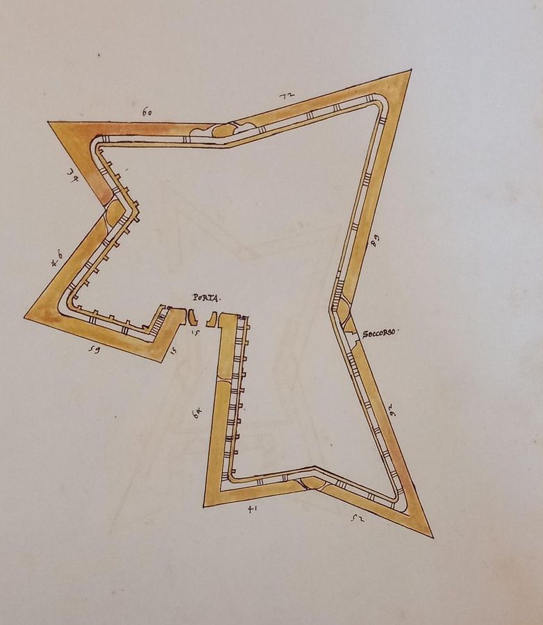 Foto 3 - Giovanni Battista Belluzzi. Rilievo della pianta del forte Stella. Penna e inchiostro, acquerello giallo Fondo nazionale. Biblioteca nazionale centrale Firenze