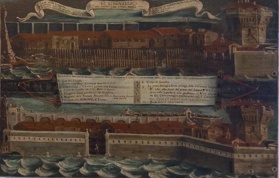 Questa evoluzione della fortificazione, nella darsena, è ben documentato in un dipinto, olio su tela, dove nella parte superiore è la Linguella come stava e nella parte inferiore come sta dopo le nuove fortificazioni avvenute alla fine del seicento tra cui la edificazione della muraglia in sostituzione della palizzata.